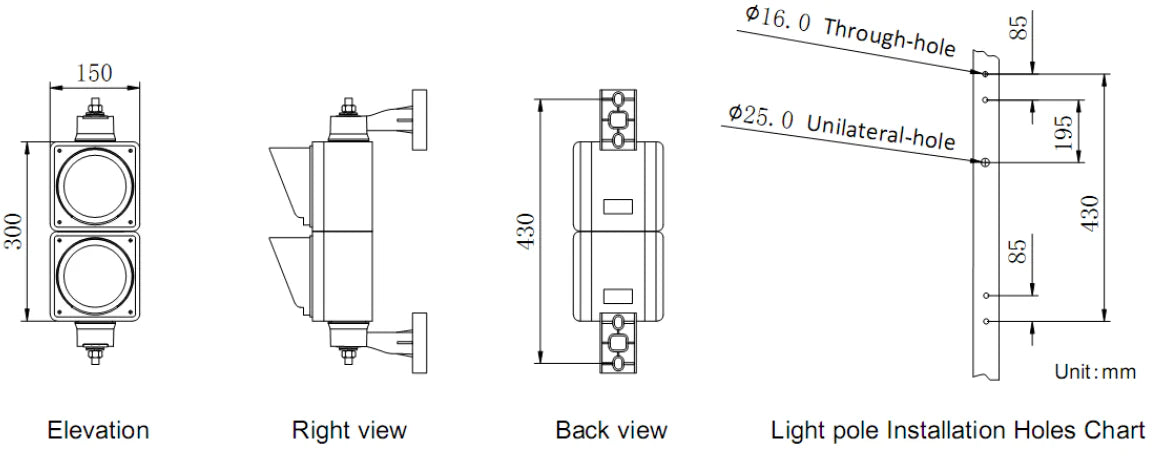 2 aspect 100mm LED Traffic light comes with sun visor and right angle mounting brackets to be easily mounted to a pole or wall. Each modules has 31 internal high output LED's rated to an approximate 80,000 hours.